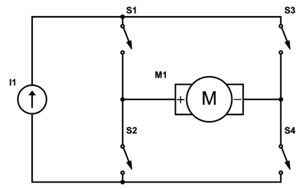由于用途如此广泛,了解 H 桥电路的应用及其工作的基本原理对设计过程中非常有益。 “H 桥”这个名字来源于 H 桥原理图的大致形状。基本层 H 桥的原理图包括位于“H”水平部分的待切换负载,以及位于“H”垂直构件上的四个开关(见图1)。 图 1.一个基本的 H 桥,用于创建可逆直流电机驱动器。图片由作者提供 在如上所示的基本 H 桥中,负载可通过电路中的开关接收不同极性的电流。根据原理图中的编号方案,我们可以看到,当 S1 和 S4 同时闭合时,电机将沿一个方向旋转。当 S2 和 S3 闭合时,电机将沿相反方向旋转。 设计上,决不允许S1/S2 对或S3/S4 对同时闭合。如果 H桥 同一侧的两个开关(如 S1 和 S2)同时闭合,将导致电源直接短路,从而可能损坏电路或导致故障。